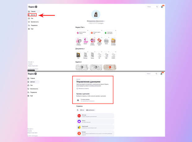 По каждому сервису и вашей истории вы можете сделать выгрузку архива данных, а также удалить их. Для этого зайдите с ПК в свой аккаунт Яндекса (https://id.yandex.ru/) и выберите вкладку Данные и затем опцию Данные на сервисах. Теперь вы можете управлять своими логами, которые записывает о вас Яндекс.