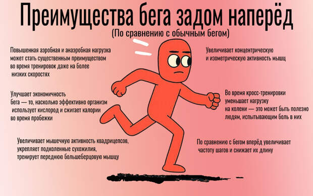 «Большую часть работы в этом случае выполняют квадрицепсы. Бедренные мышцы и подколенные сухожилия при беге задом наперёд работают иначе, потому что они не толкают вас вперёд. При этом больше работают ягодичные мышцы. Такая вариация снижает нагрузку на коленный сустав, особенно на переднюю крестообразную связку».