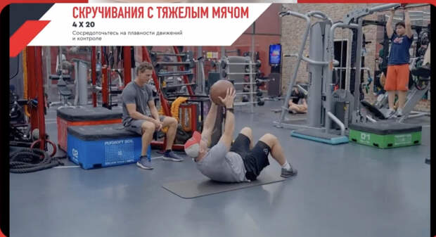 «Последнее упражнение на мышцы кора, на пресс. Хороший вариант с отягощением и медболом. Нет излишнего подъема корпуса с пола.