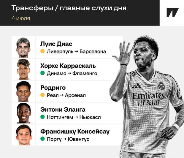 Лондонцы готовы к масштабным вложениям: сделать бразильца самым дорогим трансфером лета. Но Родриго не торопится – хочет принять решение после клубного ЧМ. Вингер попросил приостановить любые контакты с «Арсеналом» до конца турнира, потом он намерен поговорить с Хаби Алонсо.