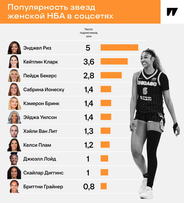 10 игроков WNBA имеют более 1 млн подписчиков, в то время как ни один клуб не достиг даже 700 тыс.