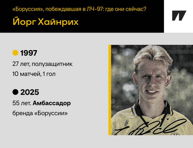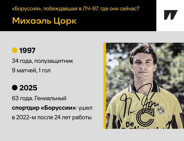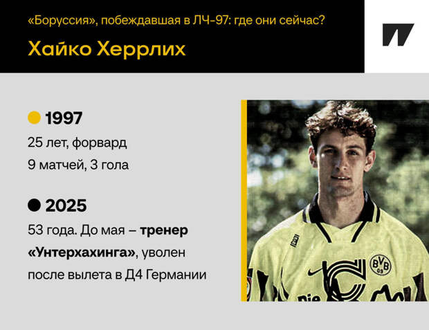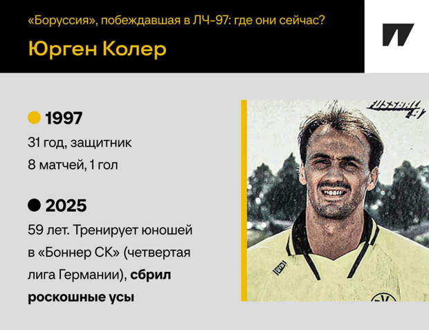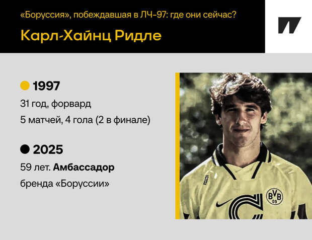 Команда поделилась на группы и постоянно ссорилась. А 20-летний атакующий полузащитник Ларс Риккен был здоров, но проходил армейскую службу − на матчи брал специальное разрешение.Несмотря ни на что, «Боруссия» прошла «Осер» (3:1, 1:0), а затем засушила «Манчестер Юнайтед» (1:0, 1:0). Чтобы попасть в финале на «Ювентус» с Дешамом, Зиданом и еще пачкой топ-звезд. На статус андердога «Дортмунд» ответила дублем Карл-Хайнца Ридле в первом тайме.