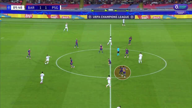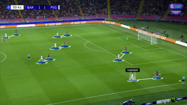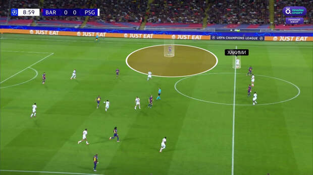 Будь у «Барсы» в этом эпизоде левый защитник, ему было бы проще добежать до Ашрафа Хакими, не дать прострелить настолько легко. Возможно, Хакими принял бы мяч на ход ближе к боковой, будь крайний защитник ближе. А так – идеальный момент, чтобы обернуть офсайдную ловушку «Барсы» против каталонцев.