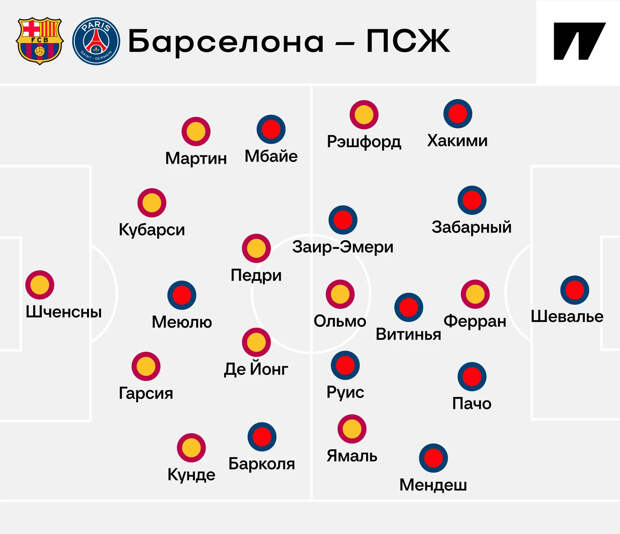 Алекс Бальде попал в заявку, но не был готов стартовать. Ханси Флик не исправил структуру игры – просто заменил отсутствующих лучшими из доступных альтернатив.«ПСЖ» остался без Усмана Дембеле, Дезире Дуэ, Хвичи Кварацхелии и Маркиньоса. Минус основное атакующее трио и капитан. Следствие проблем – выход 17-летнего Ибраима Мбайе и 19-летнего Санни Меюлю в атаке. Жоау Невеша ждали в основе, но на разминке он почувствовал боль – место занял Уоррен Заир-Эмери.