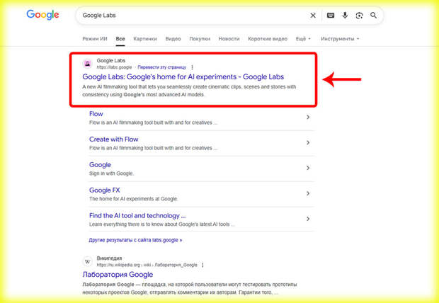 Шаг 1. Откройте Flow через Google Labs или запустите браузер и введите запрос: «Google Flow».
