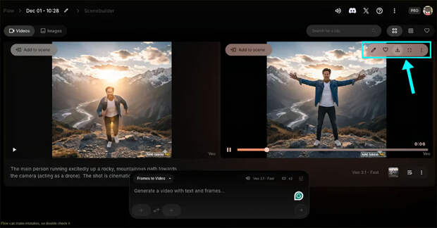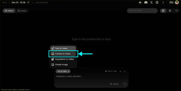 Шаг 5. В окне запроса вы увидите несколько вариантов, таких как «Text to Video» (Текст в видео) или «Frames to Video» (Кадры в видео). Поскольку мы собираемся работать с неподвижным изображением, выбирайте «Frames to Video». Это сообщит ИИ, что вы хотите добавить плавное движение камеры к статическому кадру.