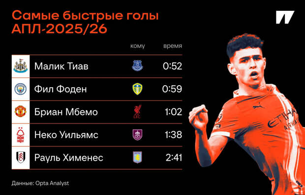 Но прошло два с половиной часа, и достижение Фила перекрыли. Защитник «Ньюкасла» Малик Тиав улучшил результат на 7 секунд – гол «Эвертону» влетел уже на 52-й.