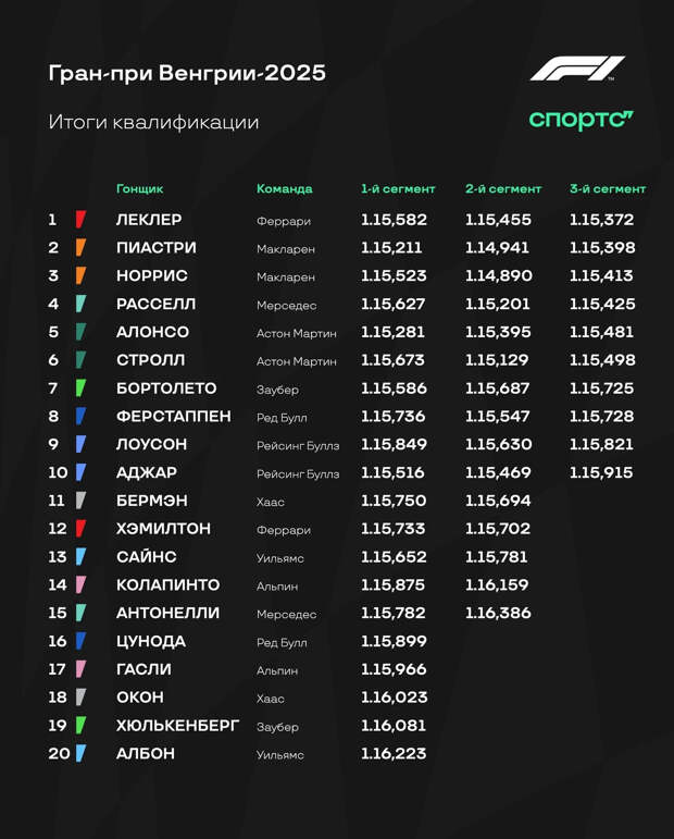 Антонелли (15-й) тоже пролетел мимо первой десятки: изначально он был 11-м, но позже его круг аннулировали из-за нарушения границ трассы. «Мерседес» привез в Венгрию старую заднюю подвеску, чтобы стабилизировать поведение болида – однако Кими все равно не давался контроль над задней осью. Именно на нее он и пожаловался после финального круга.
