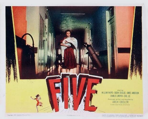 Компания из пяти выживших — четырех мужчин и одной женщины — собирается вместе после того, как новый тип атомной бомбы стер с лица земли всех людей, но оставил все постройки и природу нетронутыми. Оболер умело генерирует саспенс благодаря демонстрации пугающе безлюдных пространств, обычно наполненных людьми. От затихших автострад и пустующих магазинов тут по коже не раз пробегает леденящий холод, при том, что выглядят эти локации максимально обыденно — но именно поэтому страшно (вспомните начальные сцены «28 дней спустя», и вы почувствуете схожий вайб). Главный страх тех, кто выжил, связан вовсе не с радиацией (хотя она в фильме есть), и не с какими-нибудь жукообразными гигантами-мутантами, но с подавляющим чувством безграничного одиночества, ведь пятерка уцелевших — высыхающая капля в некогда безбрежном океане людей. А главный конфликт возникает между теми, кто готов трудиться сообща для хоть какой-то сносной жизни, и тем, кто, вопреки даже атомной войне, движим исключительно эгоизмом. «Пять» тем самым предвосхитил некоторые значимые подтексты в постапокалиптике, хотя обозначенный им драматический потенциал жанра раскроется сильно позже.