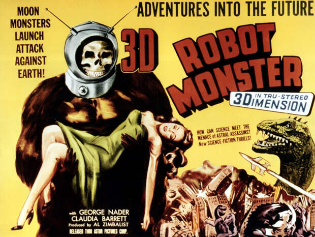 Для большинства тогдашней фантастики техногенный апокалипсис был лишь предлогом, чтобы показать побольше экзотических декораций и вычурных чудовищ. Один из ярчайших примеров такого подхода — милейший трэш под названием «Робот-Монстр» (фильм, заставивший молодого Стивена Кинга рыдать от смеха). Завязка такова: инопланетянин с неблагозвучным именем Ро-Мэн XJ-12 уничтожает все человечество кальцинаторным (что бы это ни значило) лучом, и теперь странствует по миру, выискивая недобитых людишек. Увы, по ходу беспощадной войны против оставшихся восьми землян, Ро-Мэн внезапно влюбляется в женщину и не может заставить себя закончить свою важную миссию. Визуально это тот еще цирк изобретательной наивности (для справки: Ро-Мэн выглядит как горилла с аквариумом и антеннами на голове), но смотрится с нарастающим умилением, а в конце дают поразительно внятное объяснение увиденному: все оказалось длинным сном мальчишки, который долбанулся головой о камни и уснул в пещере! В общем, любители Эда Вуда — не проходите мимо!