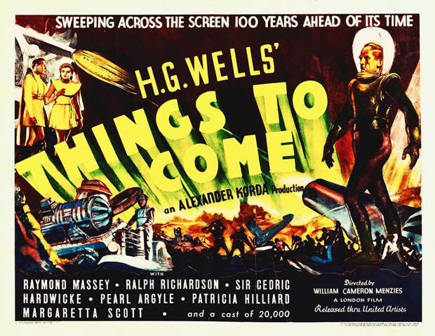 Еще одним приметным прототипом жанра был британский сай-фай «Облик грядущего» (по книге Герберта Уэллса, причем он выступил автором сценария). Его сюжет описывал мировую войну (ударной силой в которой стала авиация) и последующую пандемию «бродячей болезни», после которой к власти на Земле приходит глобальное правительство, потихоньку разгребающее завалы архаики на пути прогресса и к 2030-м, наконец, запускающее человека на Луну — разумеется, из гигантской пушки, как завещал классик Жорж Мельес. Ну и еще один fun fact: «бродячая болезнь» из фильма превращает людей в кровожадных психопатов, которых приходится беспощадно расстреливать — ничего не напоминает?