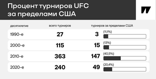 В 2010-х UFC совершил глобальный рывок. К концу десятилетия практически половина турниров в году проходила за пределами США