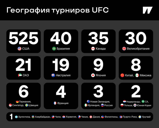 Появление гораздо более удобного для бизнеса Апекса сократило число выездов, но глобальная экспансия не прекратилась. Она продолжается в форме физического присутствия (на карте UFC появились Франция, Азербайджан, Катар и Саудовская Аравия), так и в форме различных инфраструктурных проектов (UFC PI в Мексике, расширение базы в Китае и появление новых фитнес-клубов в сети UFC Gym и UFC Fit).