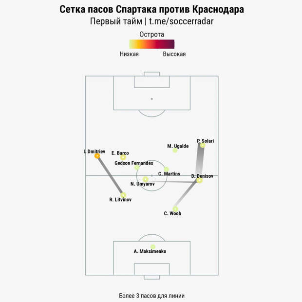 У «Спартака» все в порядке с заполнением штрафной, вторым темпом, но нет отлаженных алгоритмов по выходам на кроссы. Маркиньосу не хватает качественной поддержки от крайнего защитника, чтобы чередовать смещения в центр с откатами в лицевую. Правый фланг предсказуем из-за однообразия Солари и Даниила Денисова.