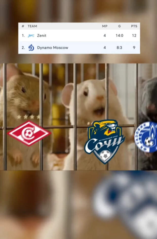 В ролике хомяк с наложенной эмблемой «Зенита» говорит: «Все знают, что это моя территория. Скажите, моя, да?» Мыши («Спартак», «Сочи» и «Оренбург») отвечают: «Да». Так реагировали на лидерство петербуржцев в РПЛ.