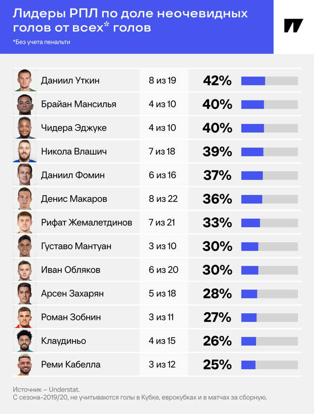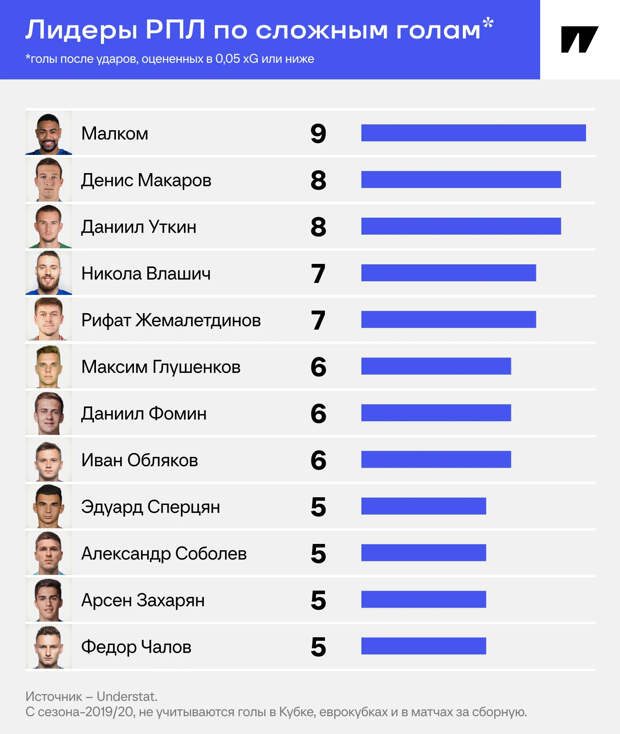 Возьмем голы, оцененные в 0,05 xG или ниже, с сезона-2019/20. Во-первых, потому что удобная дистанция, на которой выборка репрезентативна. Во-вторых, те же хронологические рамки установлены в исследовании про Гринвуда – у нас же небольшое соревнование, логично использовать одну точку отсчета. В-третьих, так удастся зацепить часть звездных легионеров еще до отъезда из России.