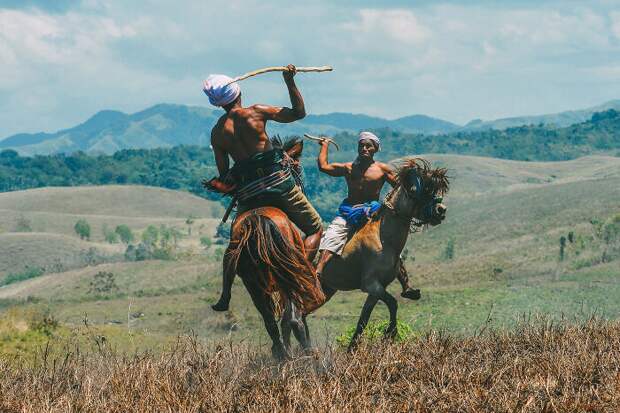 На индонезийском острове Сумба ежегодно проводят праздник Пасола — зрелищное состязание всадников с деревянными копьями. Соревнования устраиваются в честь сезона посадки риса.