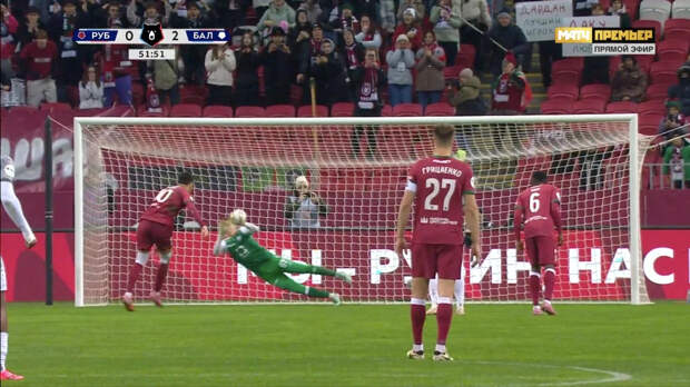 После перерыва «Рубин» чуть взбодрился – и Мирлинд Даку заработал пенальти. Кевин Андраде преследовал форварда и пихнул его в спину. Но даже здесь «Балтика» не пропустила: Максим Бориско метнулся вправо и отразил удар Даку – пусть и не под самую штангу.