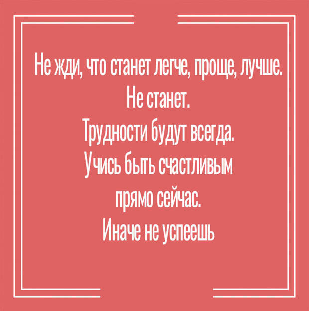 - «Не жди, что станет легче, проще, лучше. Не станет. Трудности будут всегда. Учись быть счастливым прямо сейчас. Иначе не успеешь» — из фильма «1+1»