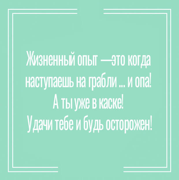 - Жизненный опыт — это когда наступаешь на грабли … и опа! А ты уже в каске! Удачи тебе и будь осторожен!