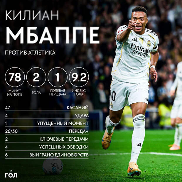 ● Килиан шикарен в этом сезоне: 25 голов и четыре ассиста в 20 матчах за «Реал». Чуть расширим выборку: у француза 62 мяча в 2025-м. 55 голов он забил в составе «Мадрида», семь – за сборную Франции. До рекорда Криштиану Роналду по голам за клуб в течение года осталось всего четыре, темп точно позволяет рассчитывать, у команды еще четыре матча.