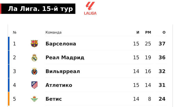 «Реал» не отпустил «Барсу» в Ла Лиге: по-прежнему всего минус один. «Вильярреал» рядом – и с матчем в запасе. «Атлетико» после поражения от «Барсы» остался четвертым.