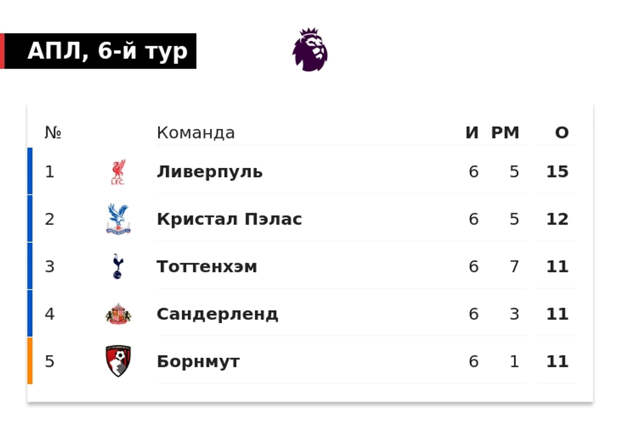 По ходу шестого тура в таблице АПЛ сформировался непривычный расклад: в зоне Лиги чемпионов «Кристал Пэлас», «Сандерленд», а возможно и «Борнмут», если у Англии вновь будет пять мест.