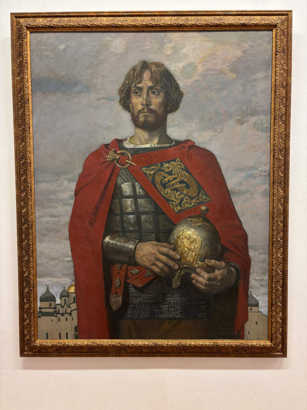 Художники обращаются к разным эпохам, поэтому повествование здесь ведут по хронологии, начало — герой Невской битвы и Ледового побоища Александр Невский, чей образ довольно популярен среди авторов: вот он, мужественный, с прямой осанкой, мчится на коне в окружении воинов на работе Юрия Орлова; потрясающий портрет Александра Невского кисти Николая Колупаева — молодой, но со взглядом старика, он стоит на фоне церквей, в руках держит шлем с изображением ангела; Дмитрий Белюкин представил Невского совсем иного — портрет парадный, но в обстановке деревянных стен дома.