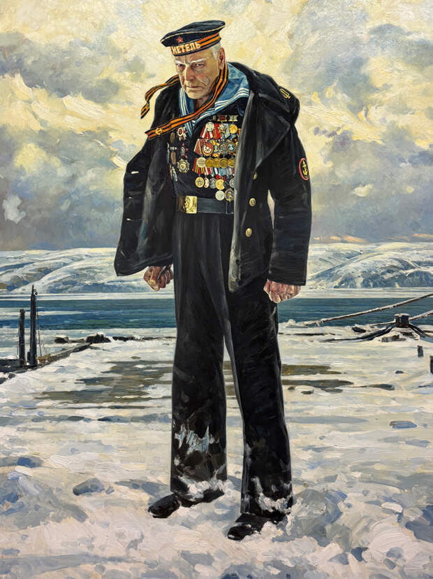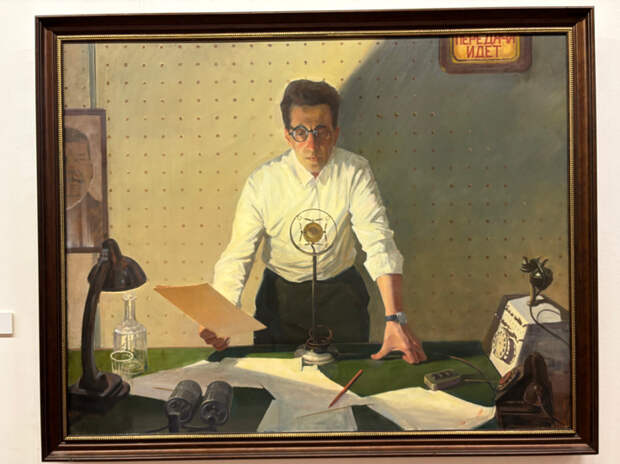 Ветеран войны, судя по фуражке, служил на «Метели», сторожевом корабле, который в годы Великой Отечественной нес дозор на Тихоокеанском флоте и конвоировал транспортные суда через минные ограждения. На груди у безымянного героя медали в несколько рядов, у него ровная, воинственная осанка, мощные кулаки, тяжелый взгляд человека мужественного, сильного, он и по сей день готов встать на защиту Родины. Другое настроение у героя картины Владимира Переяславца, солдат-столяр — молодой парень, трудяжка. Его, кажется, отвлекли от работы у станка, он повернулся, улыбнулся художнику, сказал ему что-то доброе и продолжил трудиться. Работа оптимистичная, светлая, что удивительно — обычно такими эпитетами говорят о красивых пейзажах, но никак не о мастерской, где трудится солдат во время войны, работая для фронта, и сердцем чувствуешь главный посыл художника — искренняя вера в мир и в Победу.