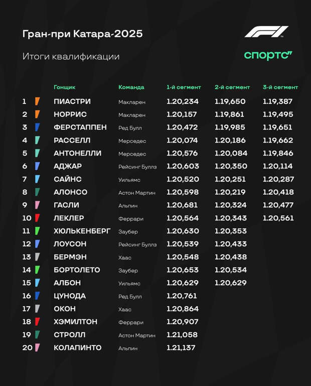 Норрис, возглавлявший протокол в начале заключительного сегмента, в решающей попытке запорол быстрый круг – и остался вторым. А Ферстаппен и «Ред Булл» после сложной пятницы сумели прибавить – Макс разместился на третьем месте. Впрочем, для борьбы с Пиастри болиду RB21 в Катаре не хватает темпа.