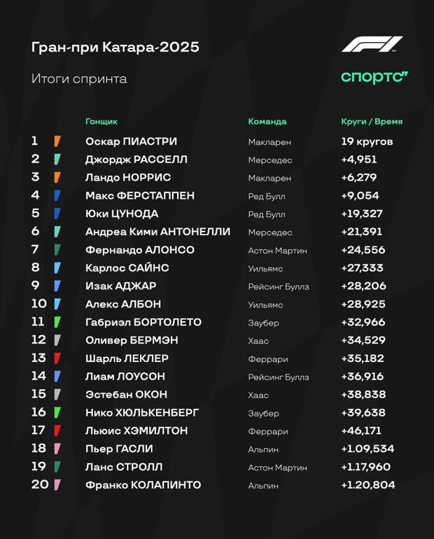 Норрис на стабильном «Макларене» спокойно удержал третью позицию, а его напарник Оскар Пиастри уверенно конвертировал поул в победу.