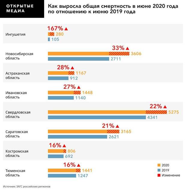 ЗАГСы 8 российских регионов — Ингушетии и Новосибирской, Свердловской, Астраханской, Ивановской, Саратовской, Костромской и Тюменской области — опубликовали данные по общей смертности в июне 2020 года.