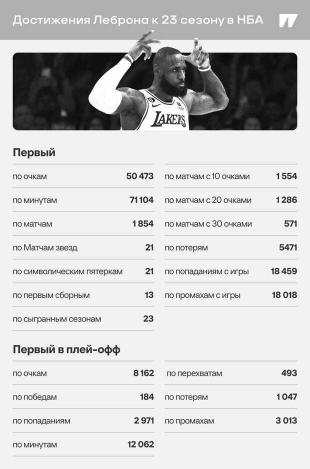 Для начала ему будет достаточно просто выйти на площадку. В таком случае он станет первым игроком, отыгравшим 23 сезона в НБА. На данный момент Леброн делит рекордный показатель в 22 сезона вместе с Винсом Картером. Следом идут Дирк Новицки, Кевин Гарнетт, Кевин Уиллис и Роберт Пэриш, на счету каждого из которых 21 сезон.