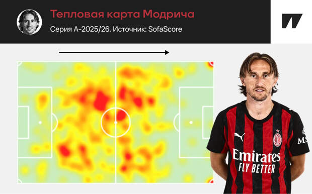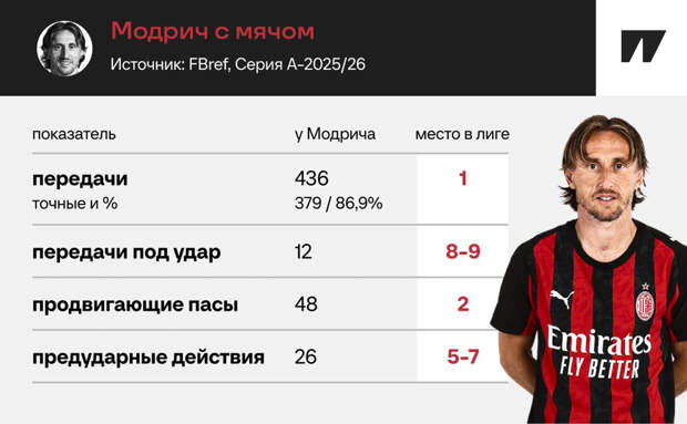 Уже сейчас, даже на короткой дистанции, видно, как сильно Модрич влияет на атаку «Милана» на уровне лиги. У него гол и один ассист, он входит в топ-10 по передачам под удар и предударным действиям, а по продвигающим пасам в Серии А уступает только Николо Барелле (49 перед этим туром чемпионата).