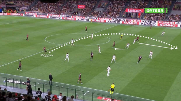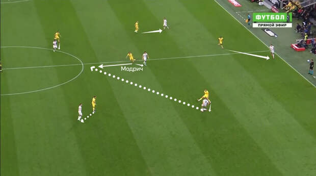Еще Модрич отметился умным движением при розыгрышах в начале атаки. Здесь он грамотно оценил ситуацию и освободил линию паса на Юссуфа Фофана. Хавбек получил много пространства и чуть не вывел на удар Хименеса после заброса.