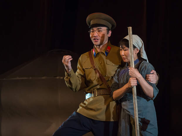 Одна из них – Чэмэд-Цэрэн – ещё жива, ей сейчас 103 года. Олег Юмов отправился к ней в Монголию, записал интервью и с ним уже поработал драматург Геннадий Башкуев – получилась пронзительная и страшная человеческая история на войне с динамичным сюжетом, полная неожиданных поворотов, разработанными характерами, удивительными режиссёрскими решениями. Это вторая точка – драматургическая: история эта не боится грязи и крови, которые и есть суть любой войны. Она вещи называет своими словами, порой грубыми и низкими. Но при этом пьеса приобретает эпических размах, монологи простых бурятских девушек ближе к финалу достойны монологов античных героев. Кроме крови, ужаса и страданий здесь сильна линия любви (юная бурятская санитарка и русский лётчик Василий), и линия идеологическая, конца 30-х годов, использованная военными и штатскими карьеристами как инструмент личной выгоды – здесь все, что было в нашей истории, в истории Монголии и Японии, попытавшейся в 1939-ом году установить контроль над Монгольской территорией. Монголам на помощь пришла работе-крестьянская Красная Армия, в рядах которой были как герои, так и мерзавцы-карьеристы.