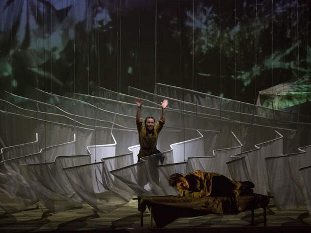 Но они не кочевники, а хорошо обученные в московской «Щуке» и питерском ЛГИТМИКе артисты. «Просто надо играть не играя», – объяснил мне после спектакля режиссёр Олег Юмов, сочинивший удивительный спектакль, где нет ничего лишнего, искусственного. В декорациях – белые юрты, белые полотнища над ними, похожими на крылья белых птиц, только не с плавным абрисном крыльев, а острым, резким (художник Сэсэг Дондокова). С декорацией в жёстком союзе видеографика (Баир Батыев). Музыка Анастасии Дружининой и Юрия Банзарова с национальными корнями – и фон, и суть происходящего. Наконец режиссером использованы элементы древних национальных мифов, которые легко вписываются в эту совсем недавнюю историю.