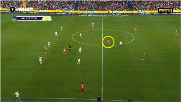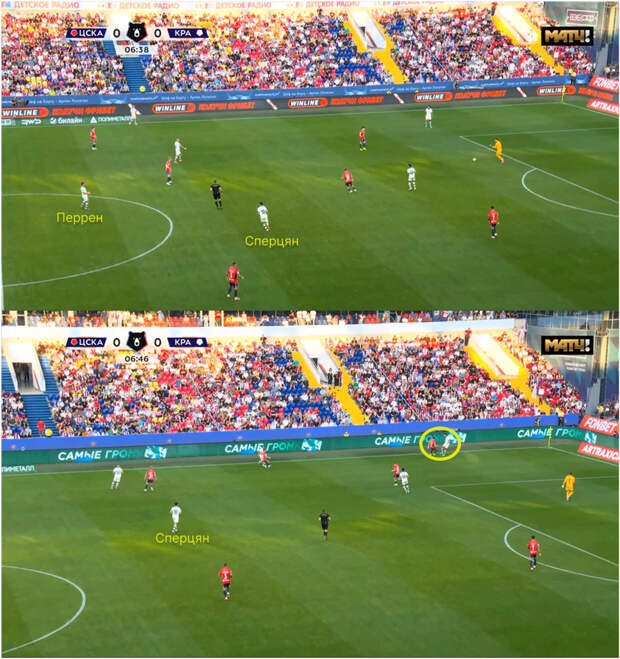 Дуэль Облякова против Сперцяна – один из самых любопытных сюжетов в первом тайме. Полузащитник ЦСКА регулярно оказывался перед выбором: прессинговать Аугусто или опускаться за Сперцяном между линиями. Проблема «Краснодара» в том, что попыток вскрыть изъян практически не было – Сперцян регулярно оказывался один за спинами полузащитников ЦСКА (на примере ниже вместе с ним неприкрытым между линиями остается еще и Перрен), но не получал мяч.