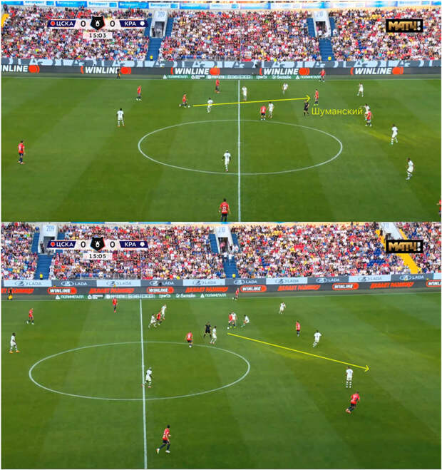ЦСКА не так много создал в первом тайме, но почти все осмысленные подходы связаны с действиями Шуманского. Вот алгоритм: Артем ловил тайминг в полуфланге, принимал мяч спиной и быстро разворачивал на фланг.