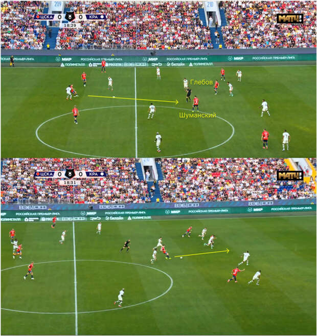На старте сезона Шуманский выходил десяткой и вингером со смещениями в середину, в этот раз номинально исполнил роль девятки. На деле Артем регулярно оказывался в глубине и освобождал пространство за спиной для рывков Кирилла Глебова.