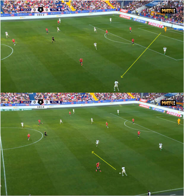 Другая проблема – невнятные действия в финальной трети после удачных выходов со своей половины. Тут Станислав Агкацев разбил прессинг прекрасной диагональю налево.