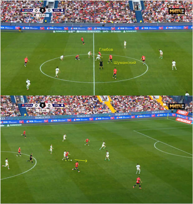 В голевой атаке Шуманский вместе с Глебовым оказался в центральной оси. Кирилл подыграл пяткой, а Артем поставил корпус Дугласу и разогнал перед кроссом Кругового.
