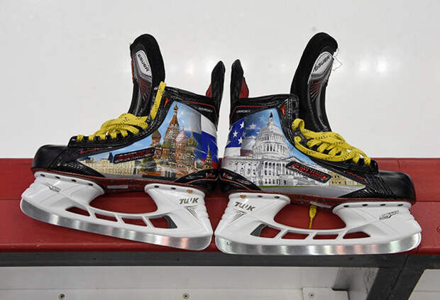 В 2017-м Ови пошел дальше и переплюнул канадца в фантазиях – не просто изменил лезвия, но и нанес полноценный рисунок на ботинке. На левом коньке появились Храм Василия Блаженного и флаг России, на правом – Капитолий и флаг США.