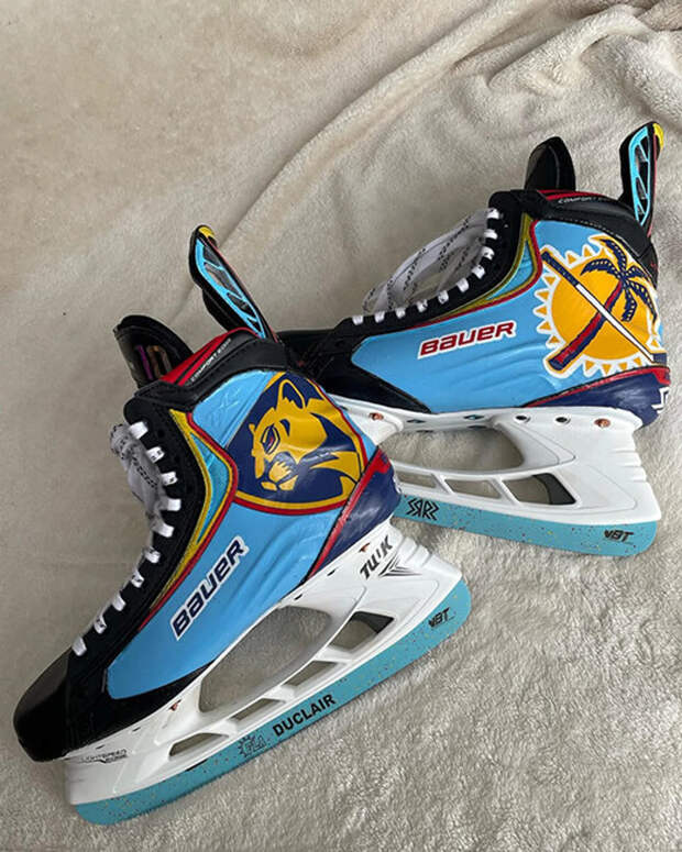 Есть в истории и более скромные примеры. В 2016 году Дастин Бафлин носил пару коньков с подписью «Баф» и любимым 33-м номером на пятке. Энтони Дюклер раскрасил ботинки в нежно-голубой – под цвет ретроформы «Флориды». Но, показав обновку публике, получил травму, а затем перешел в «Сан-Хосе», где, конечно, подобные оттенки не приветствуются.