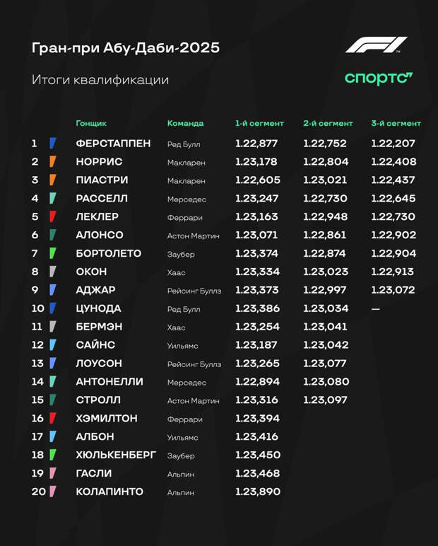 Однако Ферстаппену мало лидерства и победы. Главный соперник – Норрис – стартует вторым, и ему для завоевания титула достаточно финишировать в тройке лучших.