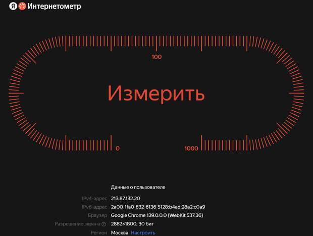 Простое и понятное решение от Яндекса. Устанавливать не нужно, поскольку это веб-сервис. Он определяет IP-адрес, регион пользователя, скорость приёма и передачи данных, а также тип устройства. Преимуществами «Интернетометра» являются высокая скорость работы, отсутствие рекламы и возможность поделиться результатами.