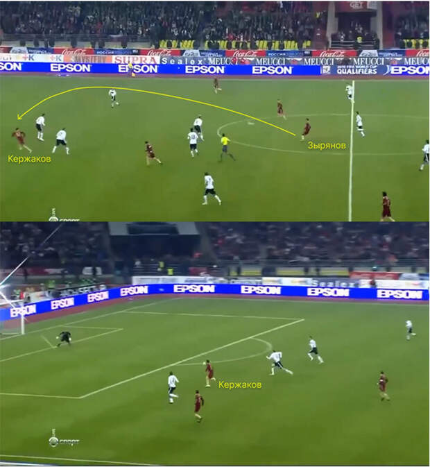 Тут Басти открылся в полуфланге и продвинул атаку на чужую треть. Игроки сборной России заняты прямыми оппонентами и не встречают. Например, на втором скрине Аршавин не смещается к немцу, а контролирует центральную ось, Зырянов спиной к мячу и следит за движением Баллака.