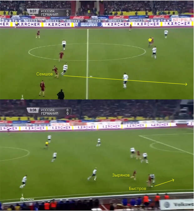 И разыгрывал в глубине как правый опорник. Тут Игорь классно разбил прессинг проникающей передачей направо, а Быстров изумительно подыграл пяткой на ход Зырянову.