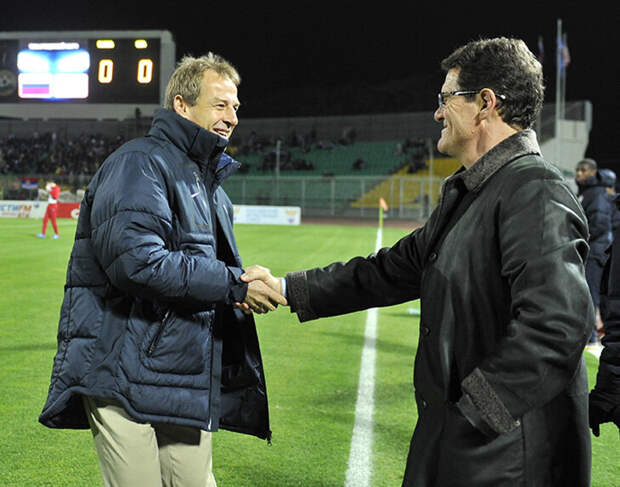 6. 14 ноября 2012 года, Краснодар, товарищеский футбольный матч Россия – США (2:2). Рукопожатие главных тренеров Фабио Капелло и Юргена Клинсманна. Всего наша сборная в современной истории пять раз встречалась с американцами – две победы, три ничьих.