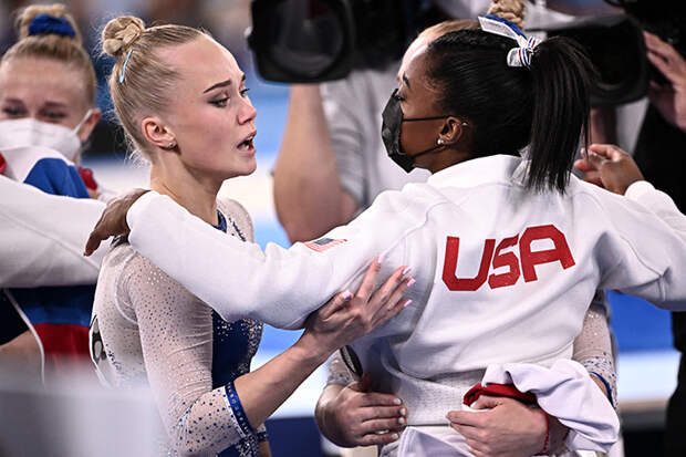 15. Симона Байлс и Ангелина Мельникова на Играх-2021 в Токио: наши тогда впервые забрали золото в командном турнире.